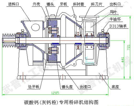 灰钙机是由主机、电控柜、立管、收粉器、除尘装置、支架等组成。灰钙机的整个粉磨过程为人工控制,给料分人工及螺旋输送两种,物料进入料斗后被吸入粉碎室在主轴高速旋转的同时利用轴上打板支架上的打板把物料打碎,达到细度要求的粉被吸入风室通过管道送到收粉器即为成品。在制粉工作中机器运行四十分钟左右,可用脚踏下排渣板几秒钟,即可完成排渣。